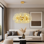 Adaugă un accent elegant și luminos oricărui spațiu cu acest candelabru decorativ auriu, prevăzut cu cristale fațetate pentru un joc spectaculos de lumini. Ideal pentru interioare moderne, clasice sau glam.
