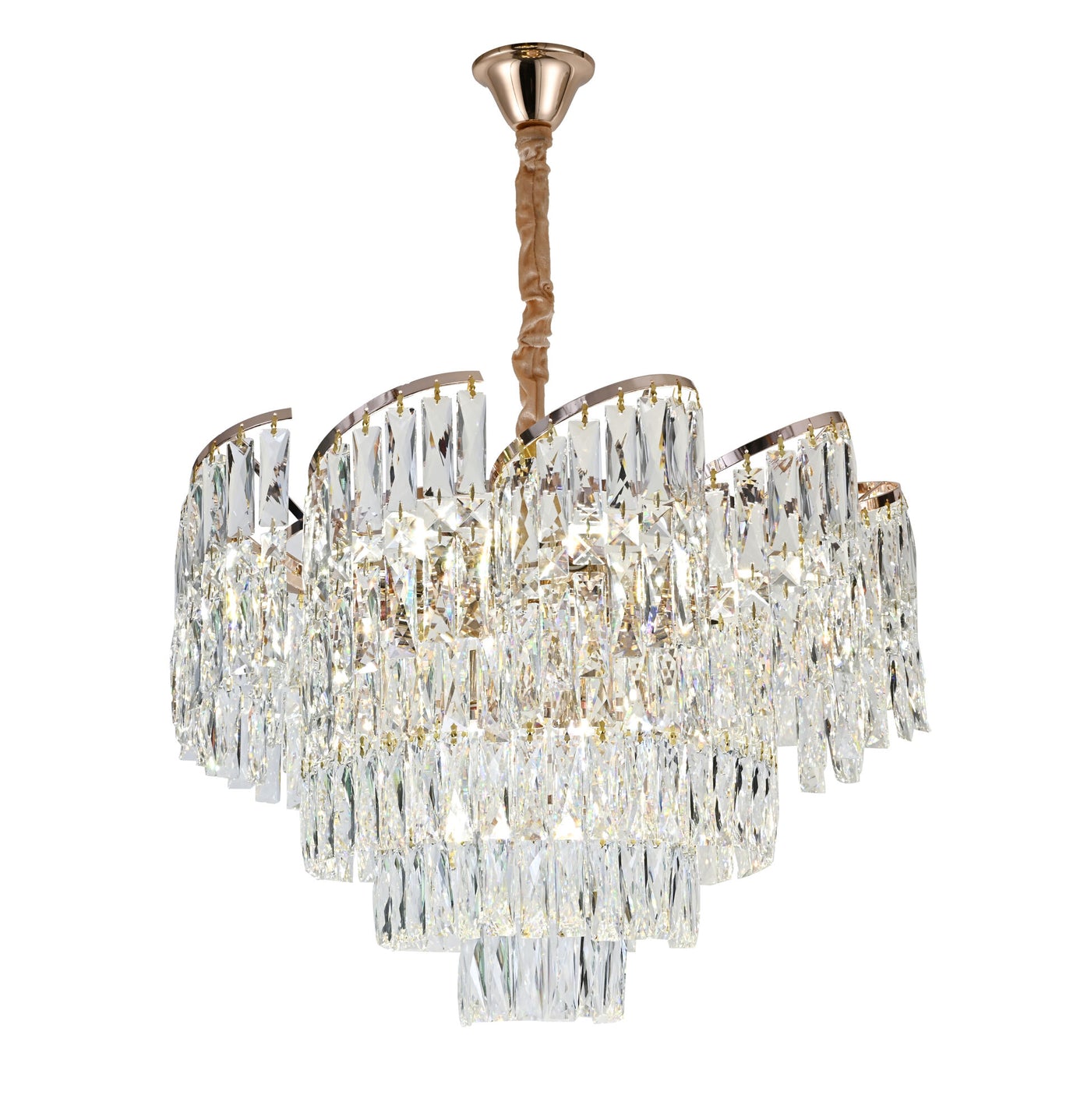 Candelabru cu cristale, 10 becuri E27, Ø580×H380 mm, finisaj auriu, design stratificat tip cascadă