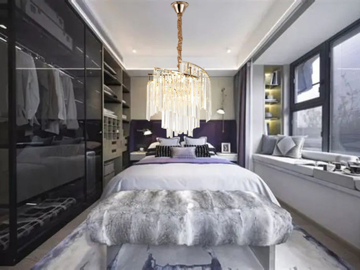 Candelabru Ø400×H380 mm, 5 becuri E27, design cu cristale lungi și structură aurie