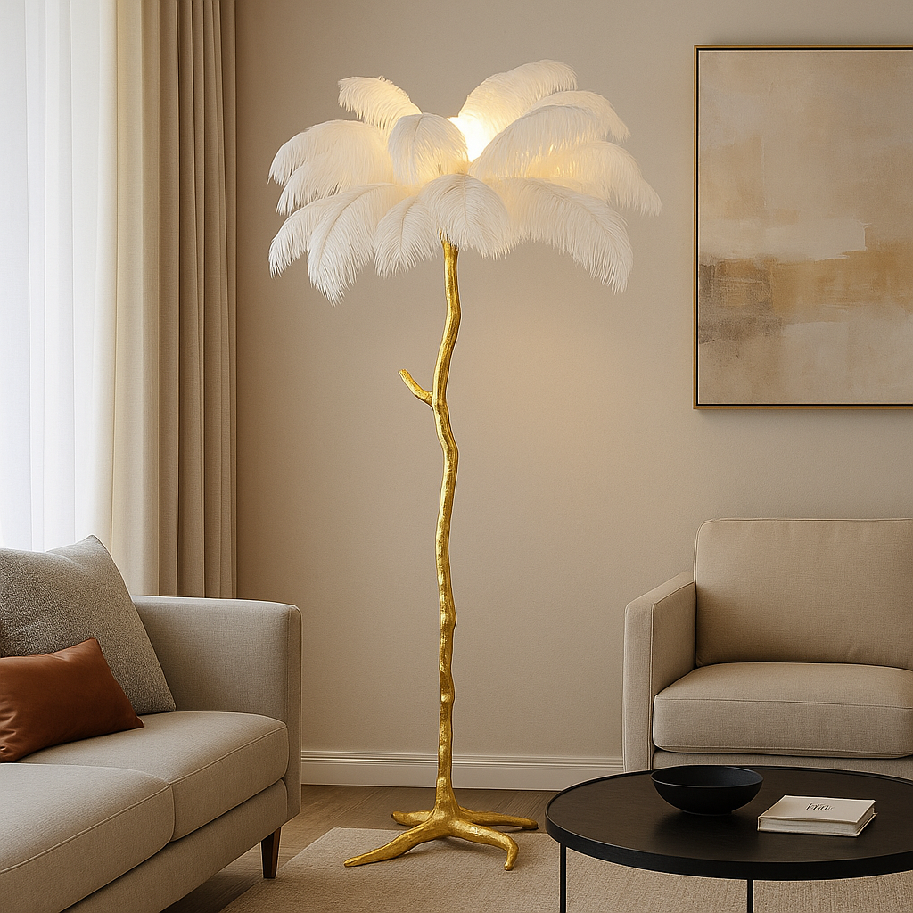 Lampadarul A888-3L aduce o notă de eleganță și rafinament oricărui interior. Cu un design artistic inspirat din natură, piciorul metalic auriu susține o coroană spectaculoasă de pene albe, care difuzează delicat lumina.