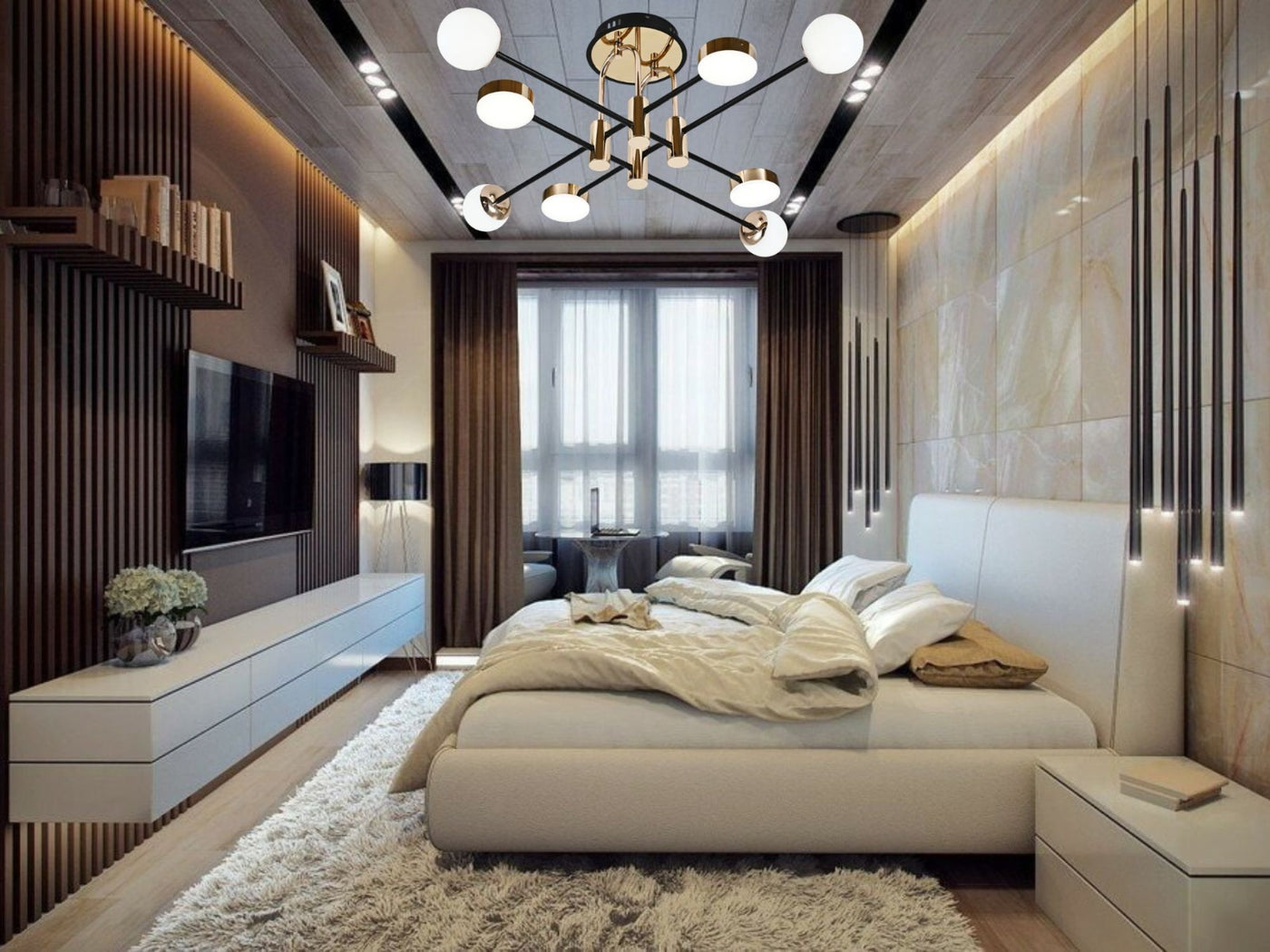 Această lustră LED se remarcă printr-un design simetric, cu brațe multiple și detalii aurii care adaugă rafinament spațiului. Globurile opal oferă o lumină difuză și plăcută, ideală pentru camere de zi, dining sau spații moderne cu influențe clasice.