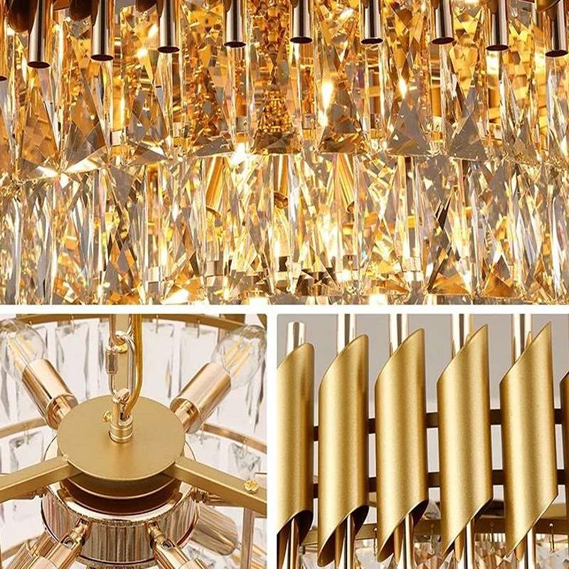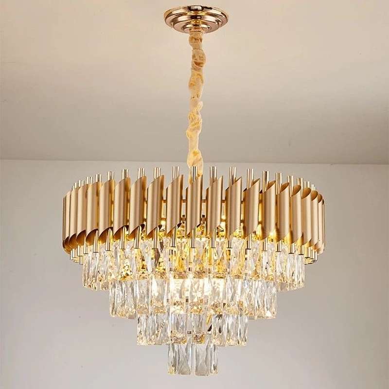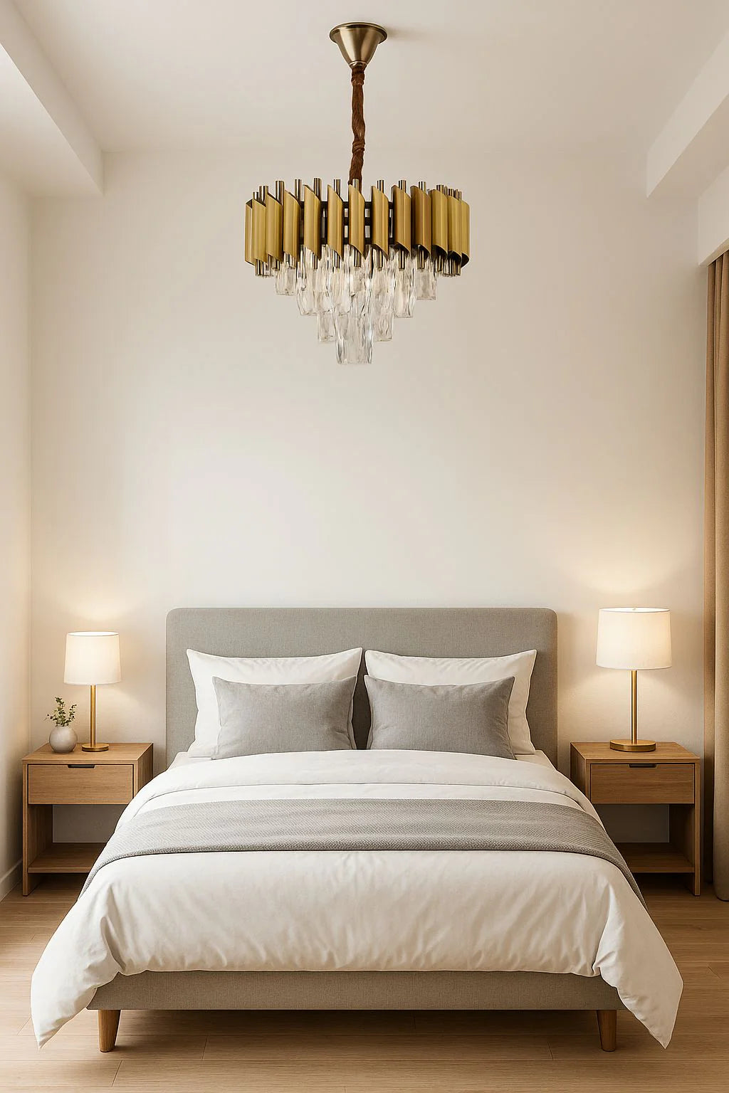 Combinația dintre elementele aurii și cristalele în cascadă creează o atmosferă luxoasă, potrivită pentru livinguri, dormitoare, holuri sau restaurante elegante.