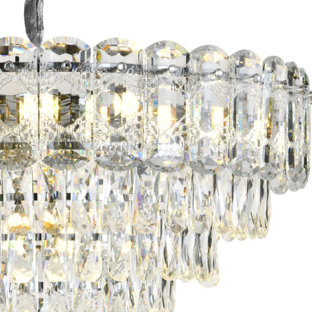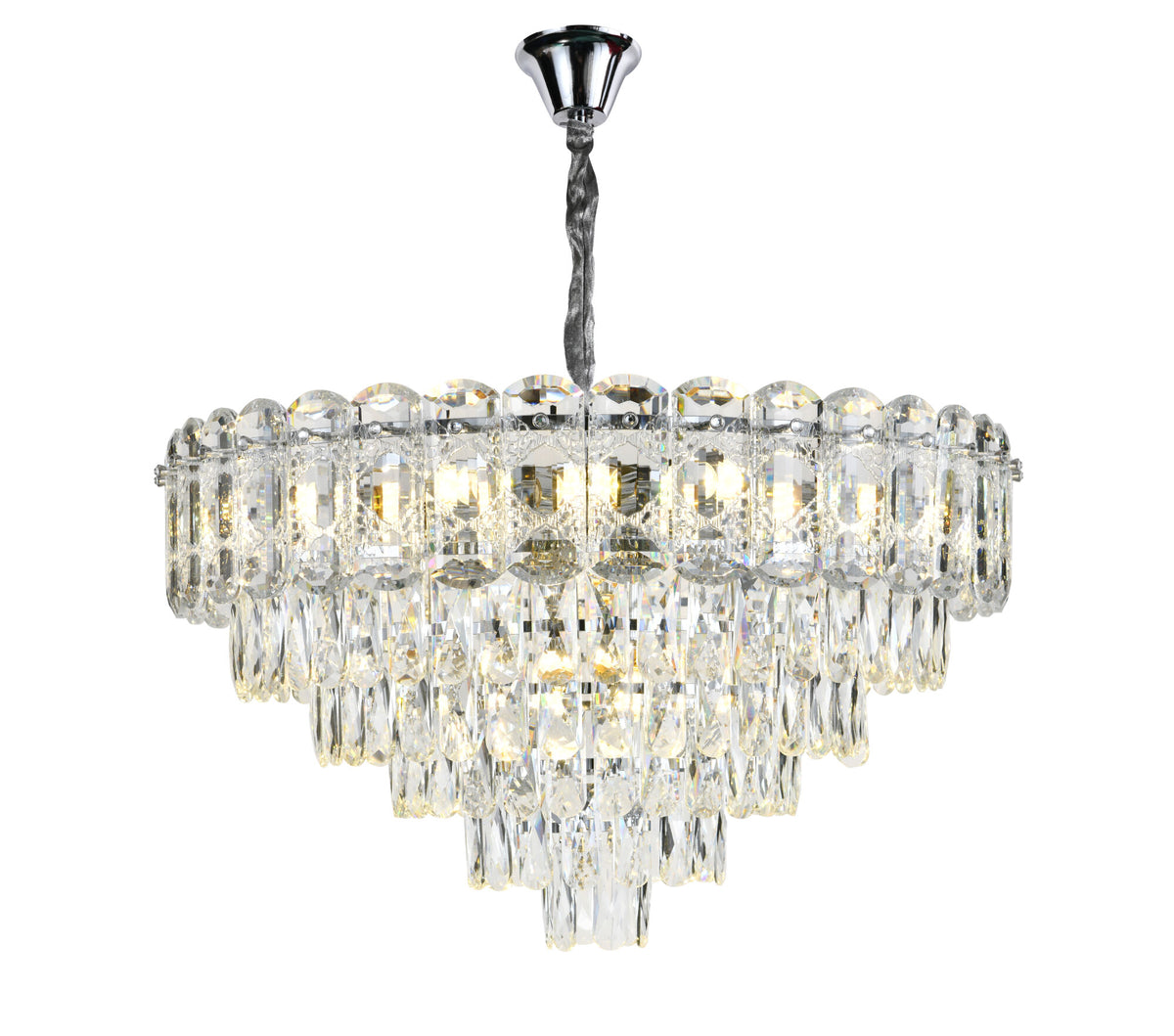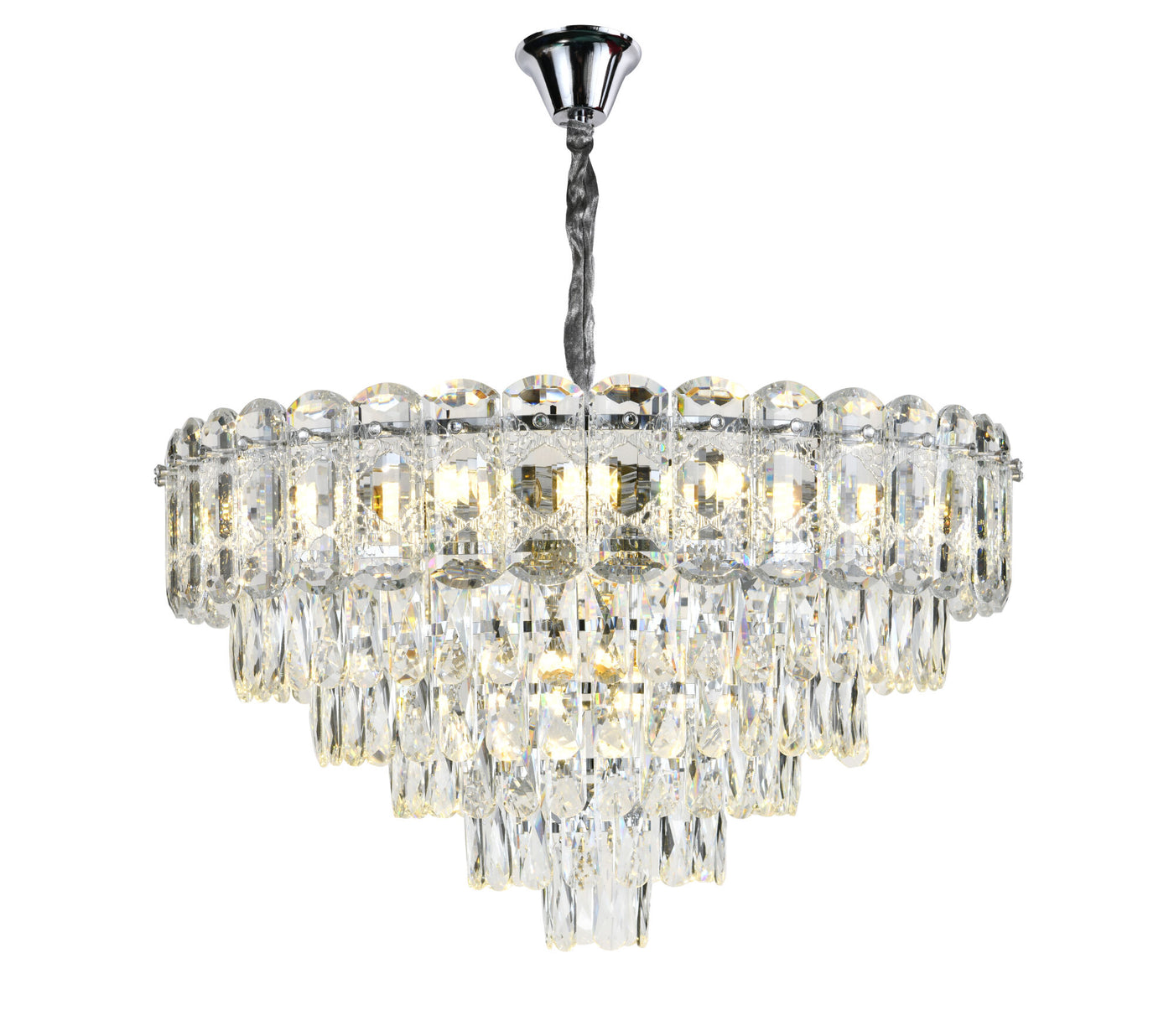 Candelabru modern, model 7058-600 GD, cu finisaj auriu și 10 socluri E27, ideal pentru iluminarea spațiilor mari precum livinguri, dininguri sau săli de evenimente. Structura sa echilibrată permite distribuirea uniformă a luminii, în funcție de becurile alese.