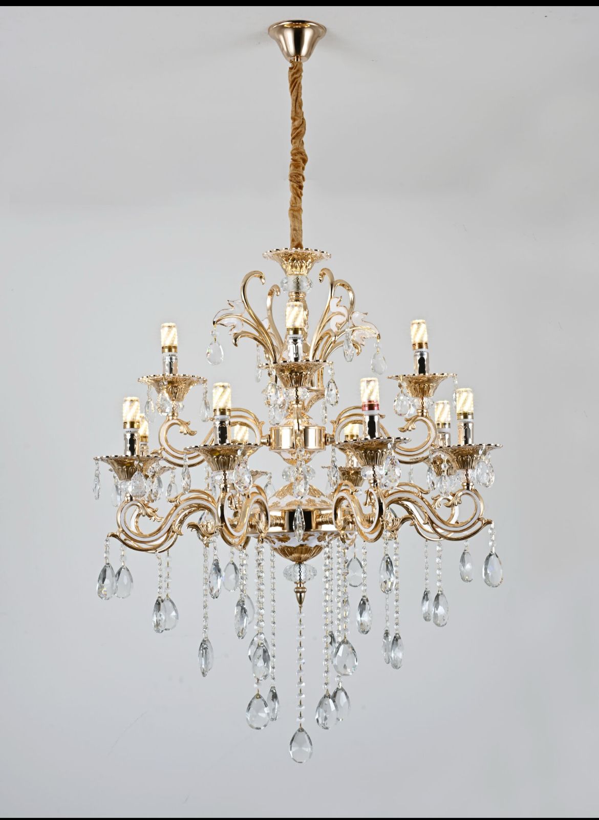 Pentru spații care cer eleganță la superlativ, modelul 2325-8+4/FGD este alegerea ideală. Cu un total de 12 brațe (8 inferioare și 4 superioare), decorat cu cristale în formă de lacrimă și un finisaj metalic auriu lucios, acest candelabru transformă orice interior într-o scenă de inspirație nobiliară.