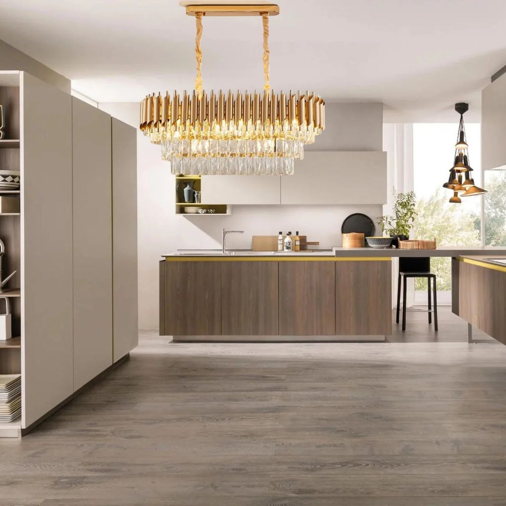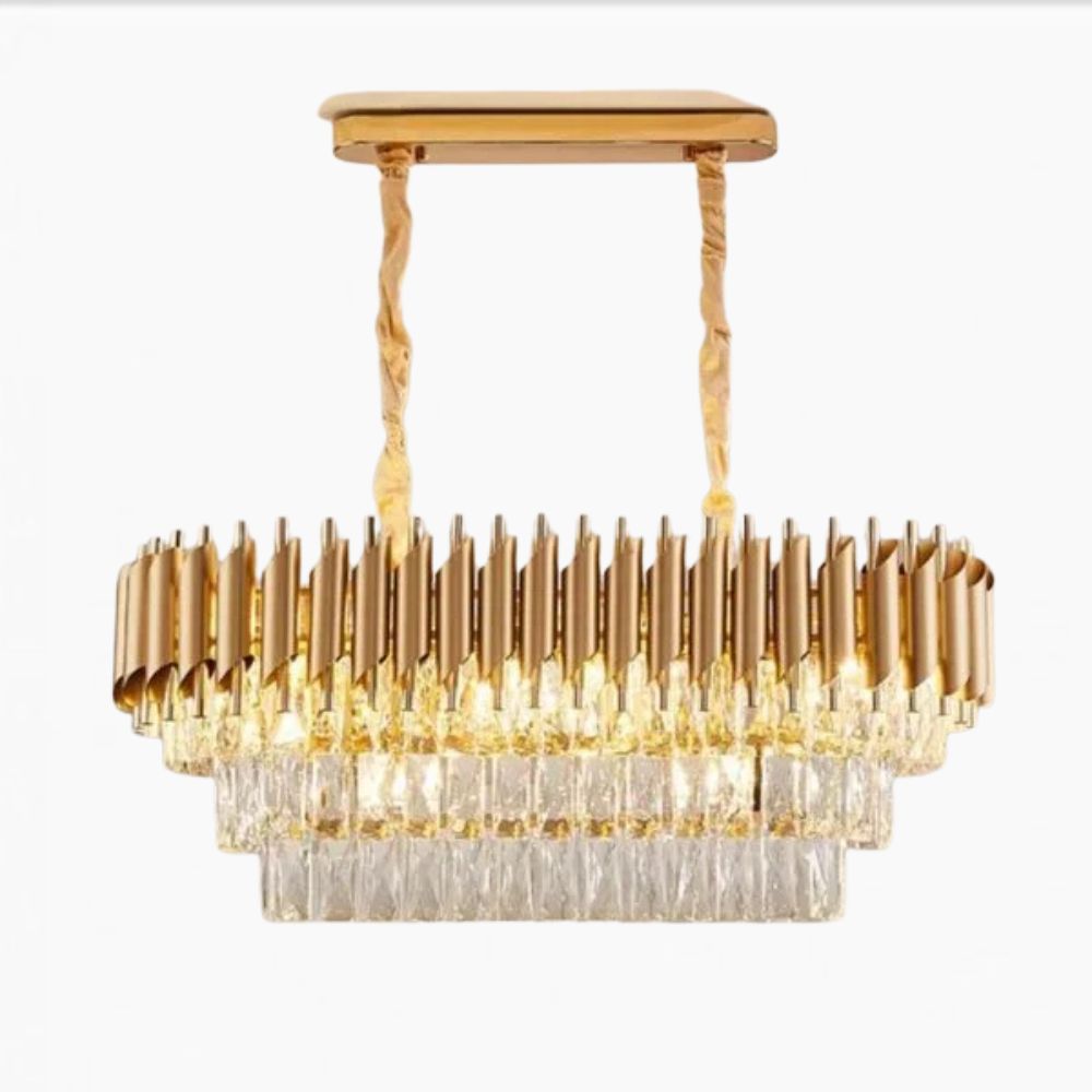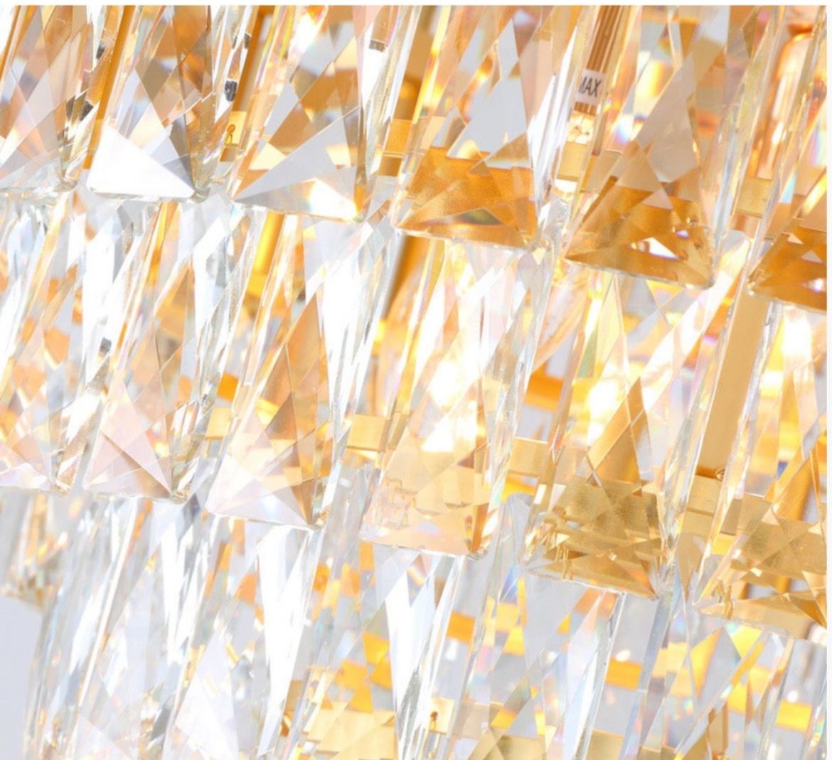 Elementele din cristal creează reflexii elegante, iar finisajul auriu conferă un aer luxos.