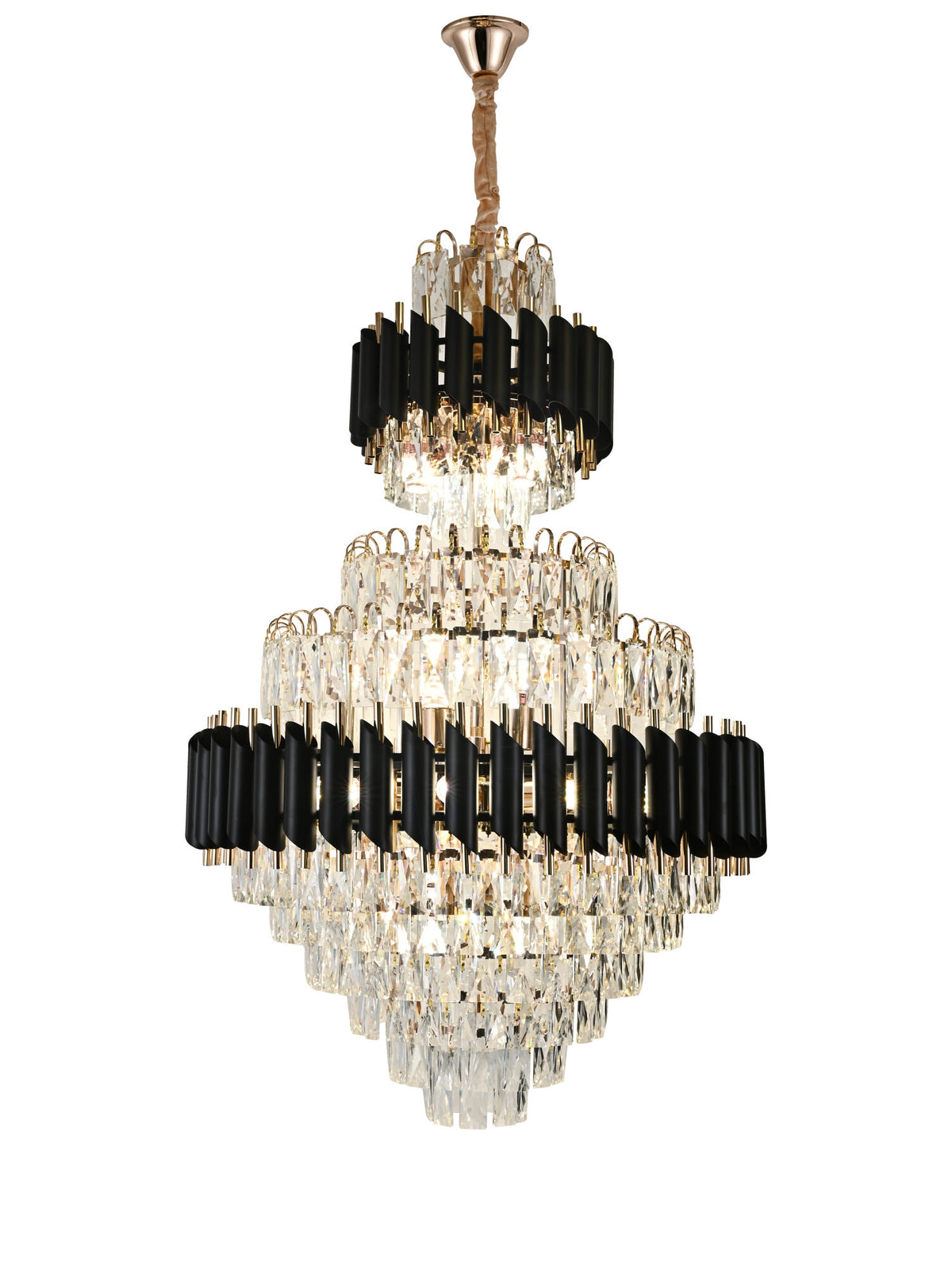 Transformă orice spațiu într-un punct de atracție cu acest candelabru impunător din seria N9001. Designul său piramidal în trepte, decorat cu cristale tăiate fin și accente elegante în finisaj auriu (FG) și negru (BK), adaugă un aer regal oricărui interior.