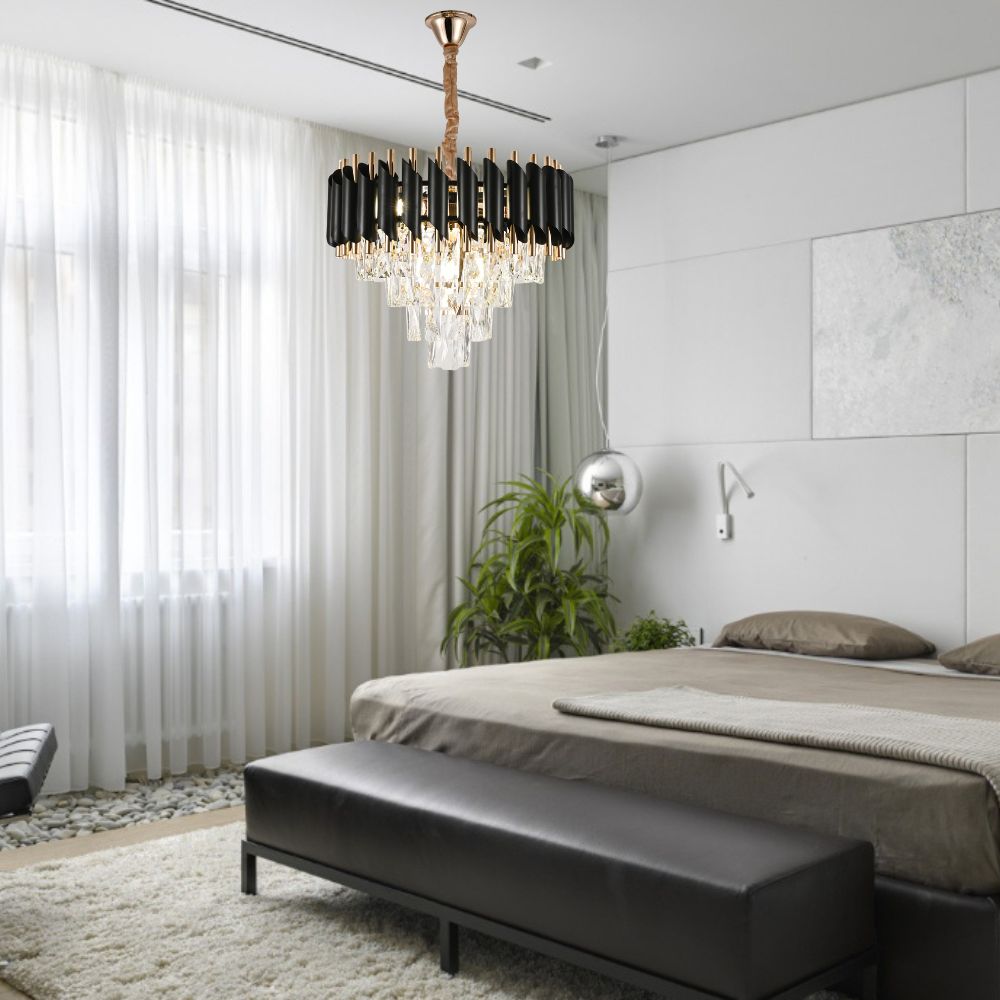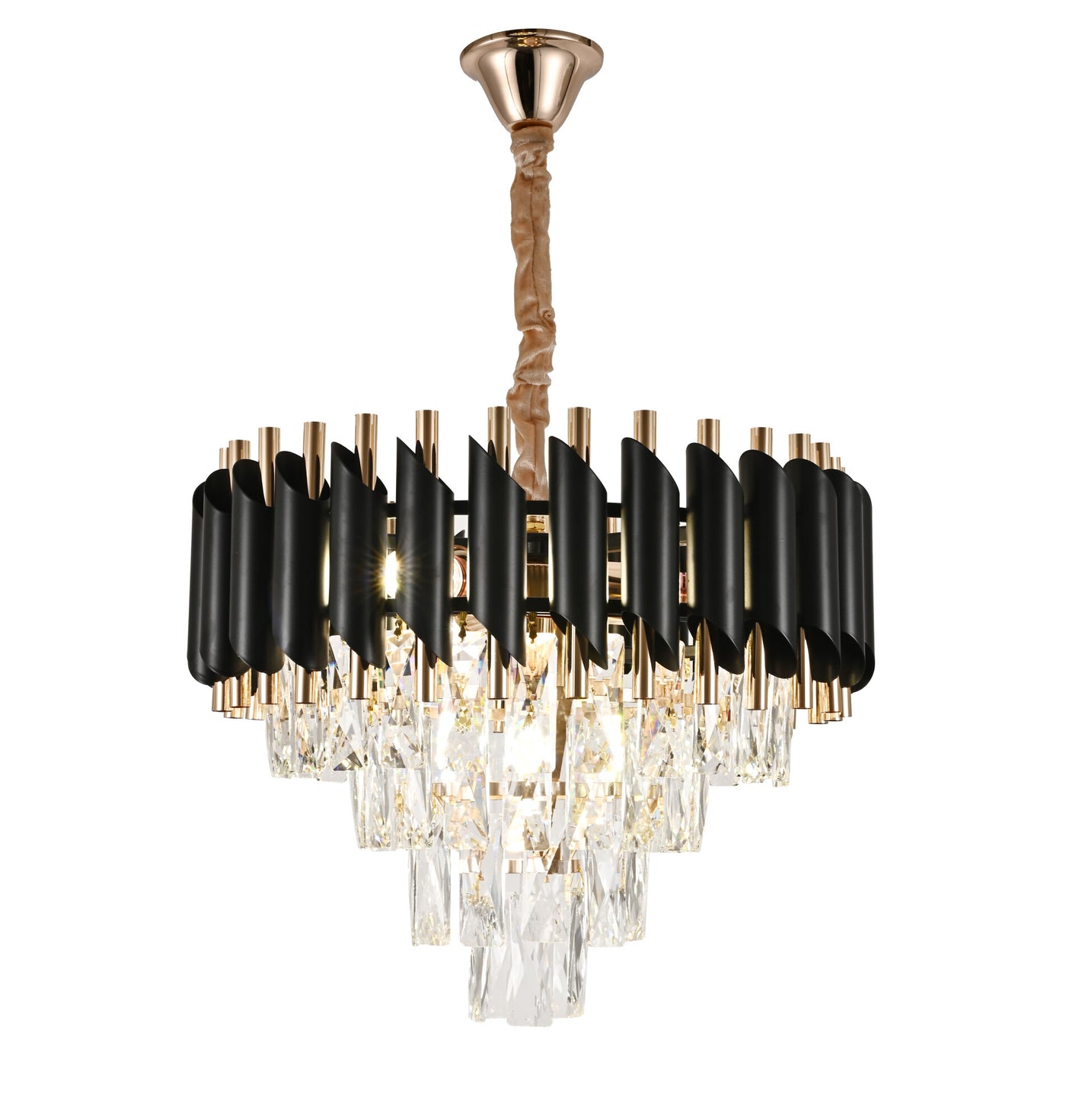 Cu detalii aurii, accente negre și cristale elegante, acest candelabru adaugă o notă glam chiar și în cele mai compacte spații.