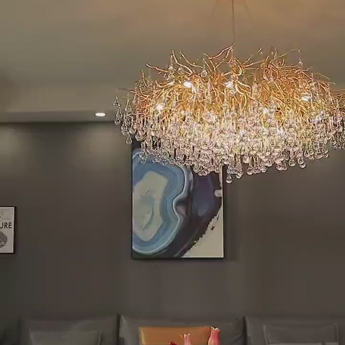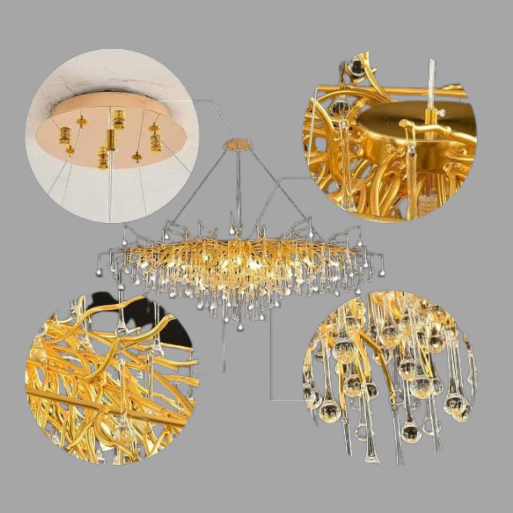 Are un diametru generos de 1200 mm și este dotat cu 10 socluri E14, compatibile cu becuri decorative tip filament sau LED. Candelabrul este împodobit cu 160 șiraguri de cristale, ce includ picături de cristal Ø25 x 80 mm și perle octogonale – oferind un efect strălucitor și opulent.