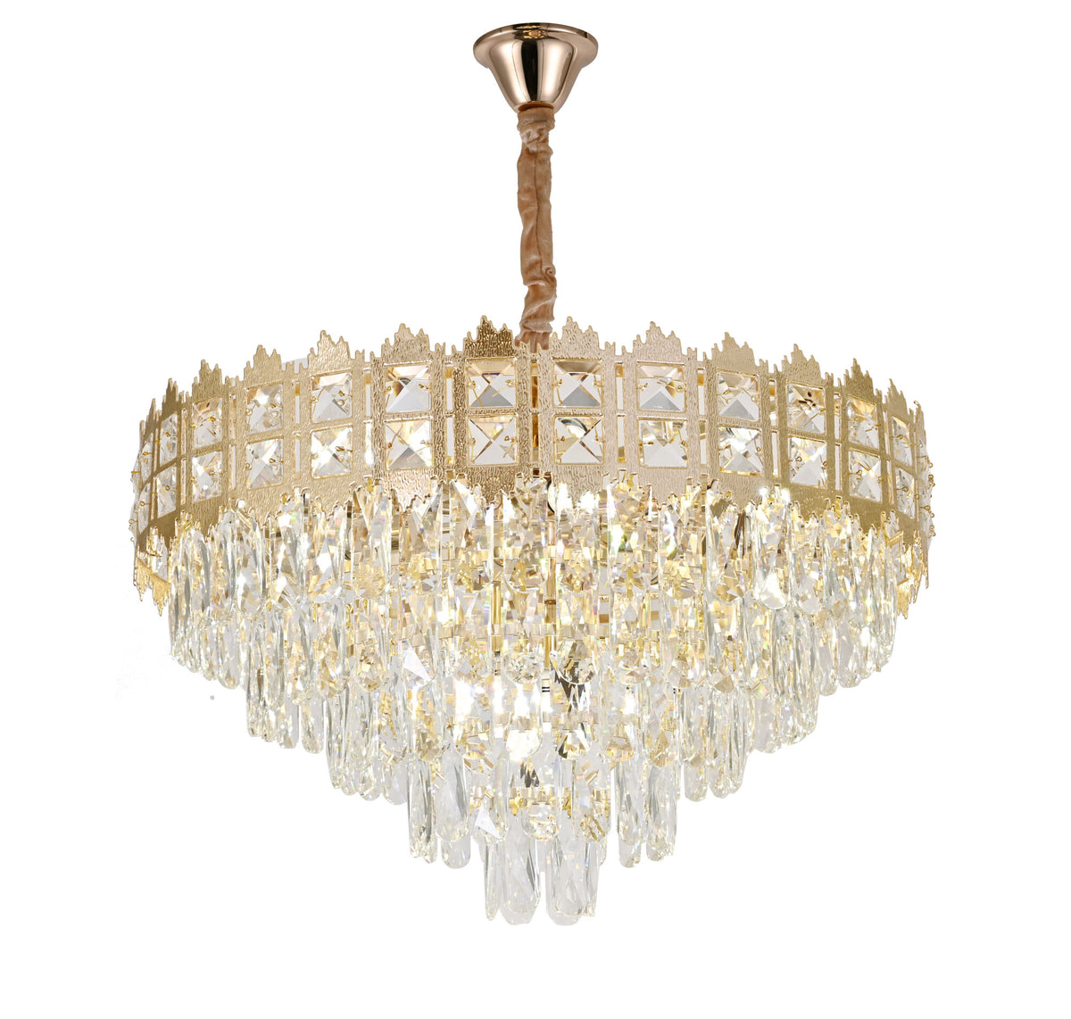 Candelabru elegant cu design modern, model 70065-600 GD, cu finisaj auriu strălucitor, ideal pentru livinguri, dormitoare sau spații comerciale. Acest model suportă până la 10 becuri E27 (max. 60W fiecare), oferind o lumină puternică și uniform distribuită. Perfect pentru interioare sofisticate în stil contemporan sau glam.