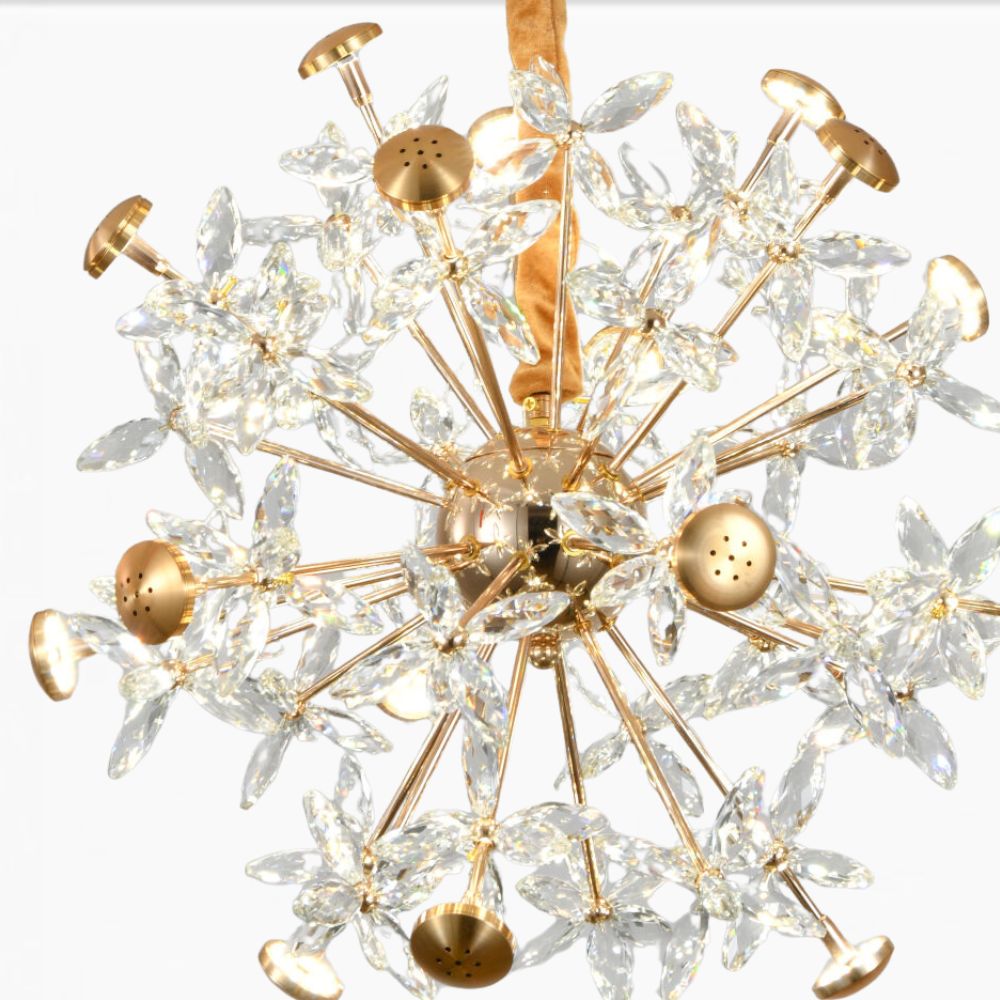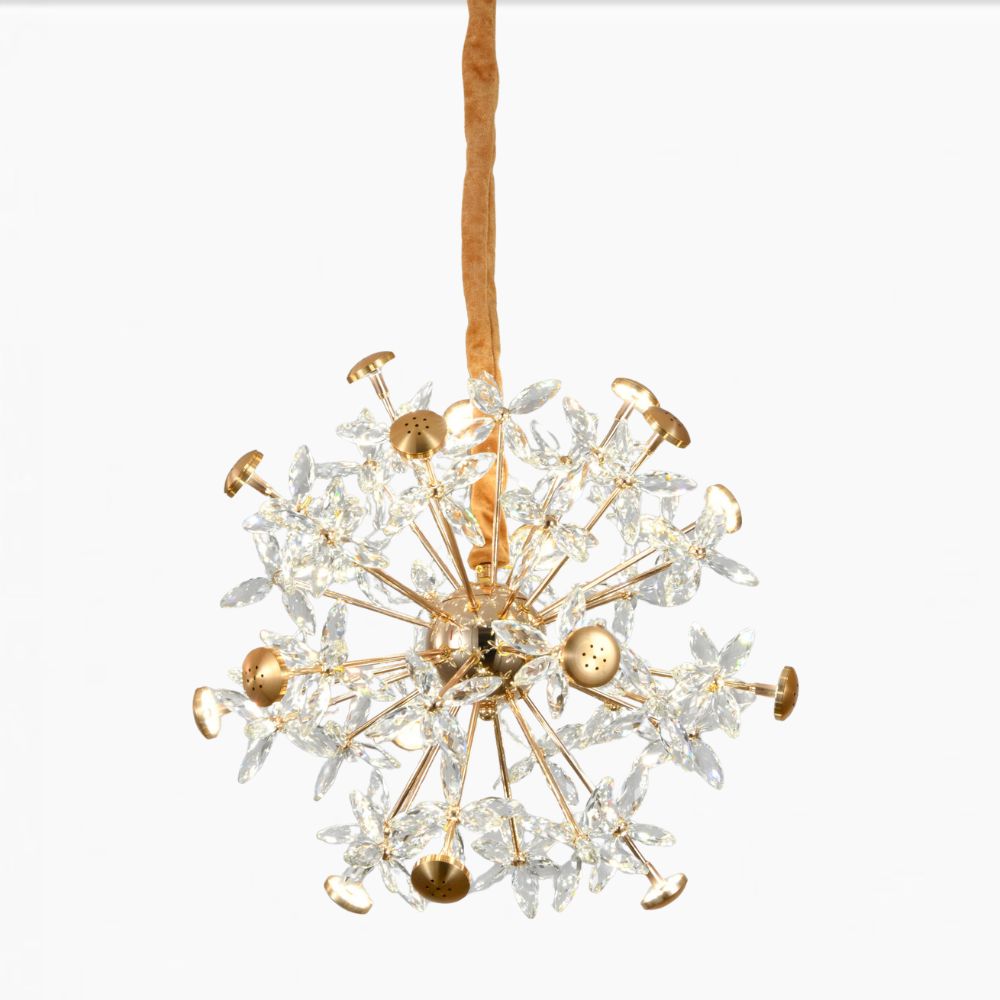 Un candelabru cu formă sferică, decorat cu elemente aurii și cristale elegante. Creează un efect vizual spectaculos și o atmosferă rafinată în orice încăpere.