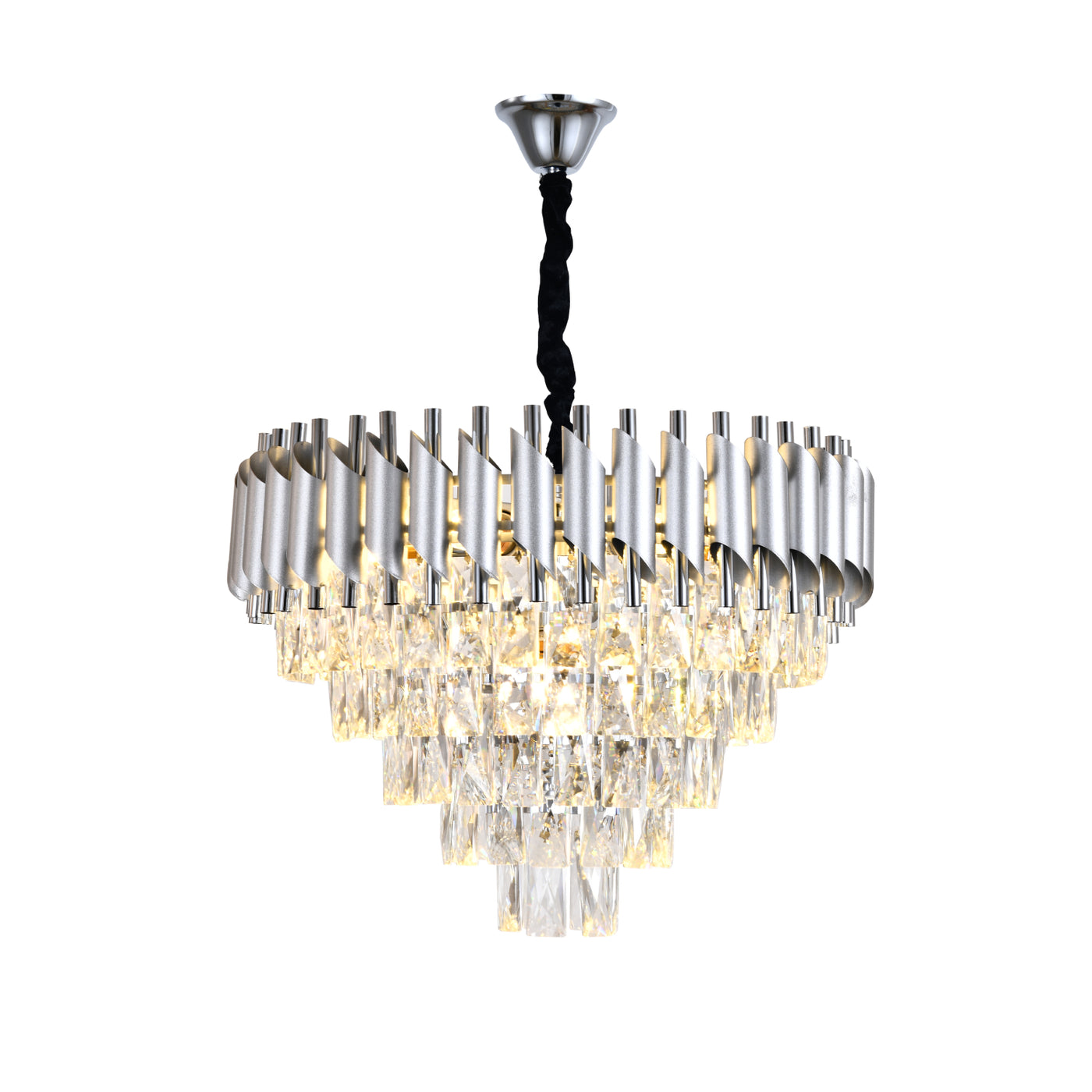 Candelabrul N9001-500 SY impresionează prin designul său elegant, combinând metalul argintiu cu cristale atent șlefuite care reflectă lumina într-un mod spectaculos. Cu 7 socluri E27 (max. 60W fiecare), oferă o iluminare amplă, fiind ideal pentru livinguri spațioase, săli de dining sau zone de recepție. Dimensiunile generoase (∅500 × H375 mm) îl recomandă ca punct central al încăperii.