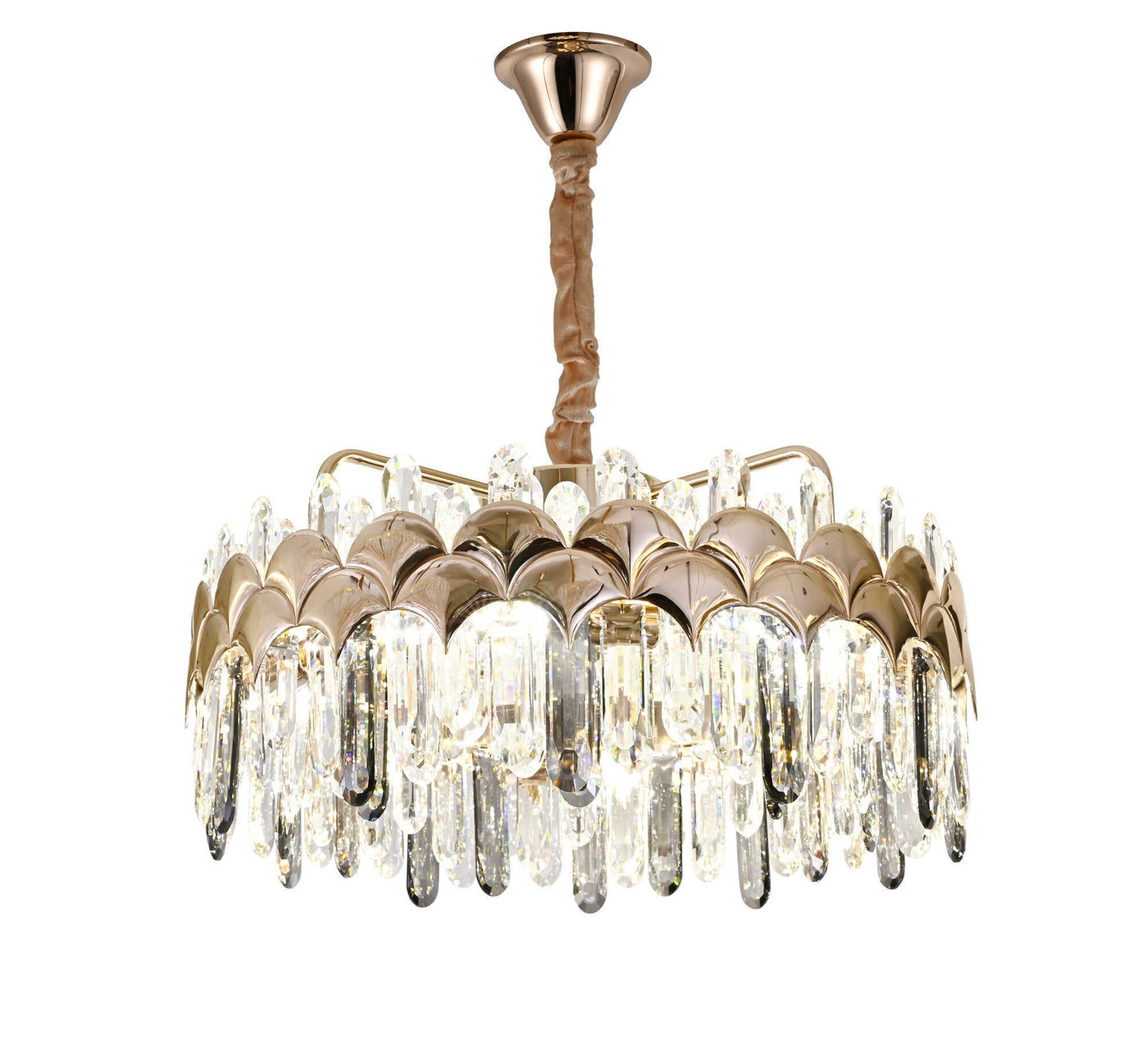 Modelul H98093/500FG este o piesă decorativă cu personalitate, ce combină luxul cristalelor verticale cu tehnologia LED de 188W integrată. Finisajul metalic auriu și dispunerea simetrică a elementelor creează o atmosferă caldă și rafinată, ideală pentru camere spațioase, holuri înalte sau zone de dining moderne.