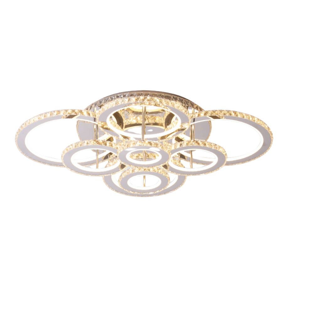 ✅ Design decorativ cu 8 inele LED – structura moderna, montaj pe tavan, cristale elegante pentru un efect luxos.