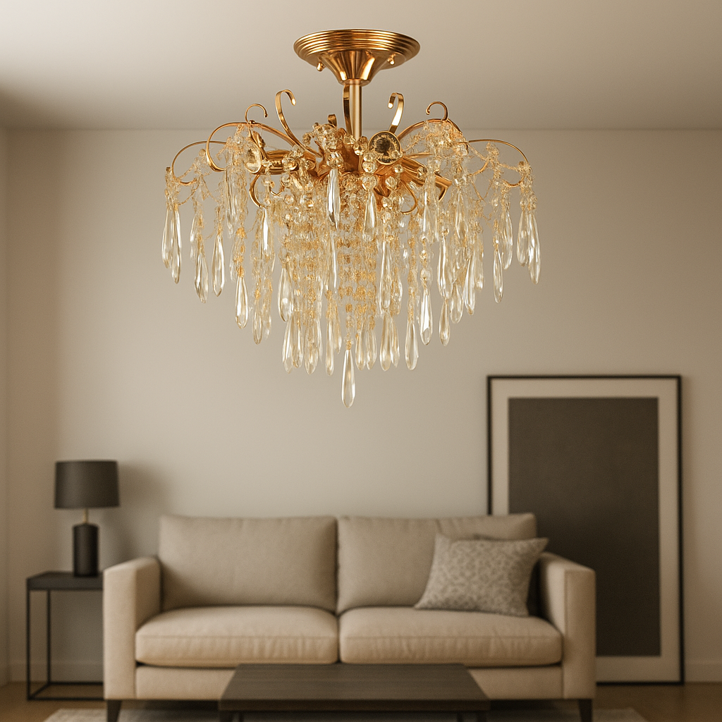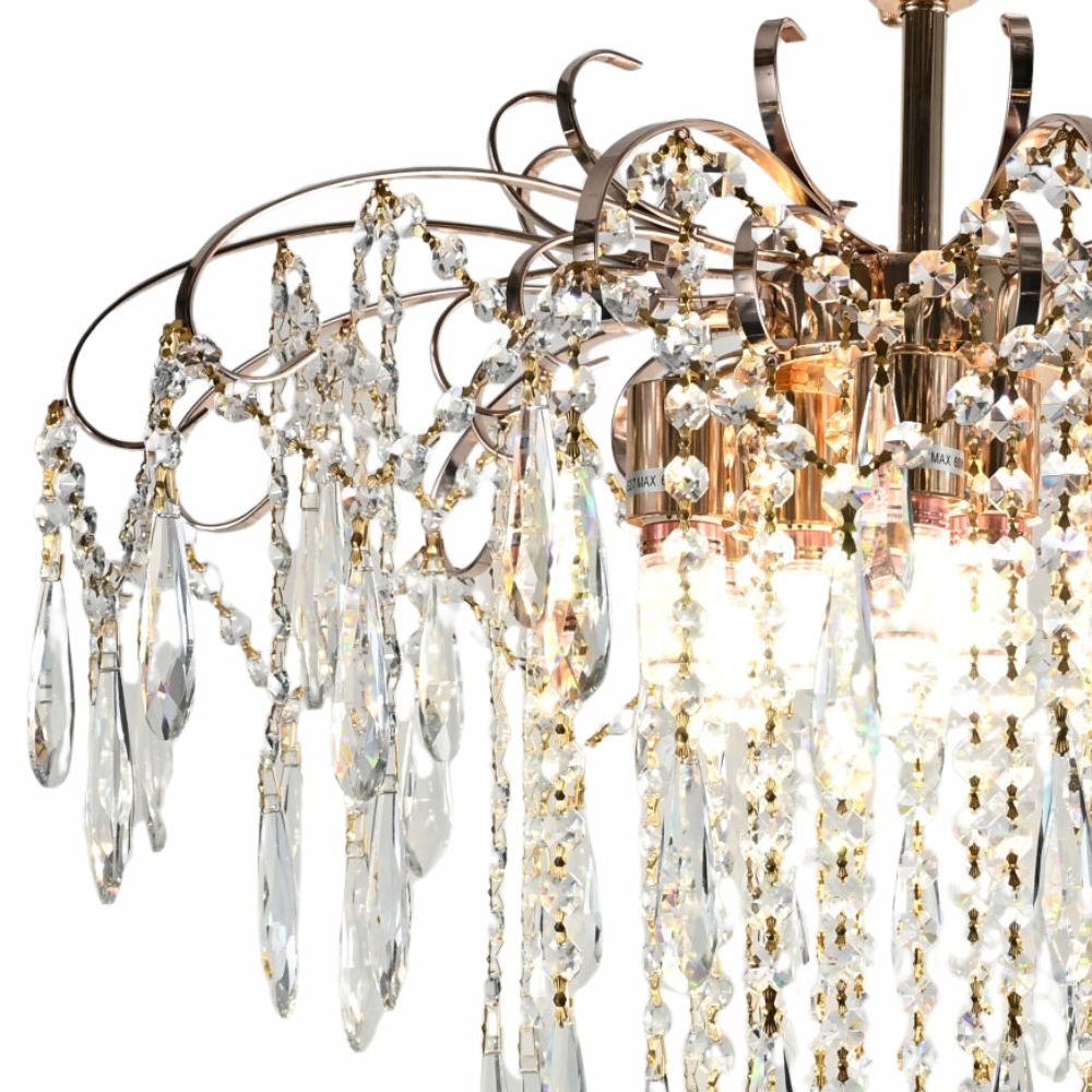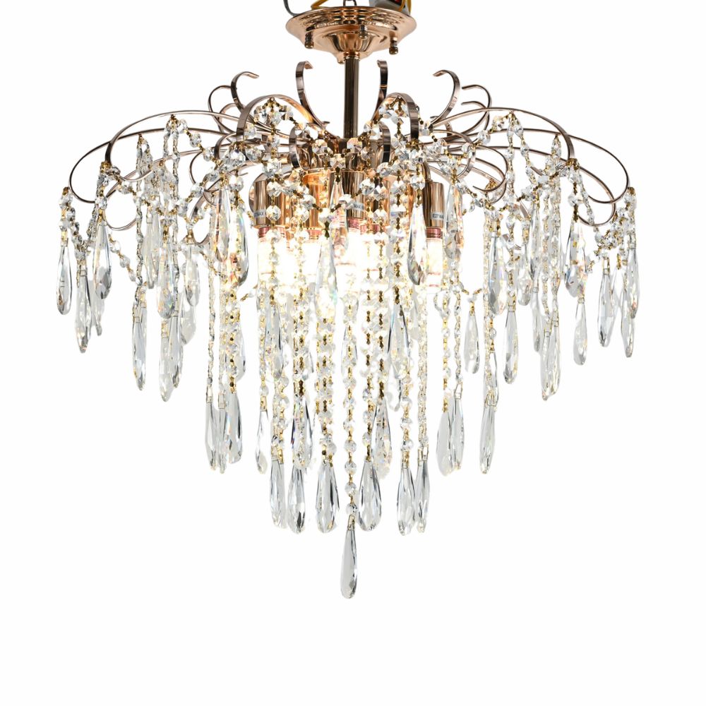 Îmbracă-ți încăperea în strălucire caldă cu candelabru 6503/5 în finisaj auriu. Brațele curbate, placate într-un ton gold elegant, susțin șiruri bogate de mărgele și picături din cristal K9, creând efectul unei cascade scânteietoare. Montat semi-încastrat, păstrează un profil grațios, ideal chiar și pentru tavane medii, fără a compromite spectaculozitatea iluminării.